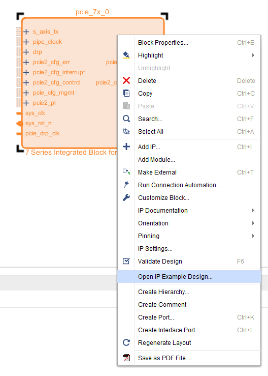 Save the design and then right-click on the pcie_7x_0 IP block in the block diagram and select “Open Example IP design”. Enter a location as to where the example project has to be created and then click “OK”.