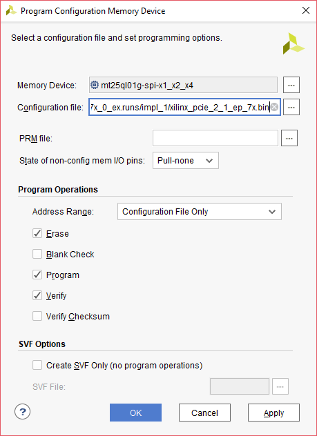 Right-click on the device and select ‘Add Configuration Memory Device…’. It will open a new window. Select Manufacturer as ‘Micron’, Density(Mb) as ‘1024’ and Type as ‘spi’. Select device ‘mt25ql 01g-spi-x1_x2_x4’ and click on OK.
