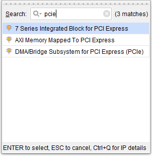 Go to the Diagram window and click “Add IP” from the toolbar as shown in the image below. Type “PCIe” in the search box and double click “7 Series Integrated Block for PCI Express” IP to customize it.