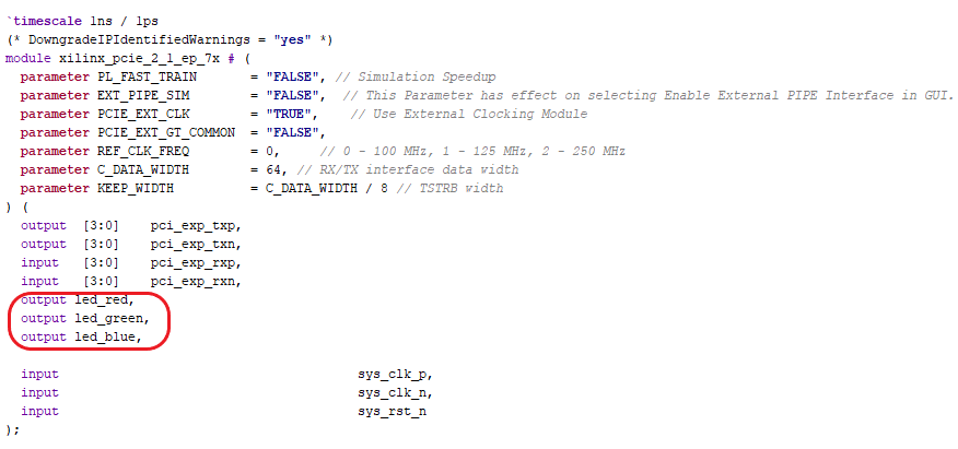 Declare the RGB led ports in the Ports declaration of the Top module(xlinx_pcie_2_1_ep_7x.v).