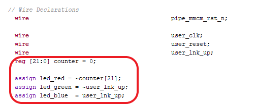 In the pcie_7x_0 IP example design, there is a user_lnk_up logic to indicate that the PCIe link between the host PC and the FPGA is ready to exchange the data when we connect the FPGA board to the PCIe slot of the motherboard. Aller board features an RGB led. Hence, connect the user_lnk_up logic output to the blue led and connect the complement output of user_lnk_up to the green led. The blue led will glow when the PCIe link is ready to exchange the data and the green led will glow when the PCIe link is not ready or when the host PC and FPGA are attempting to establish communication or when communication with the FPGA is lost due to errors on the transmission channel. So by connecting the user_lnk_up to these LEDs, we can observe that the PCIe link between the host PC and the FPGA is ready to exchange the data or not. Also, add the counter to check whether the PCIe clock is working or not, and assign the counter output to red led. So that we can observe the RGB led blinking when the board is detected by the host PC.