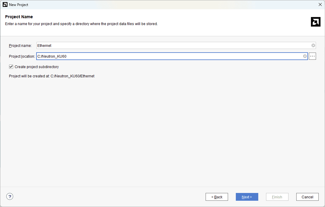 Enter a name for the project and save it at a suitable location. Check the option “Create project subdirectory”. Click Next to continue.