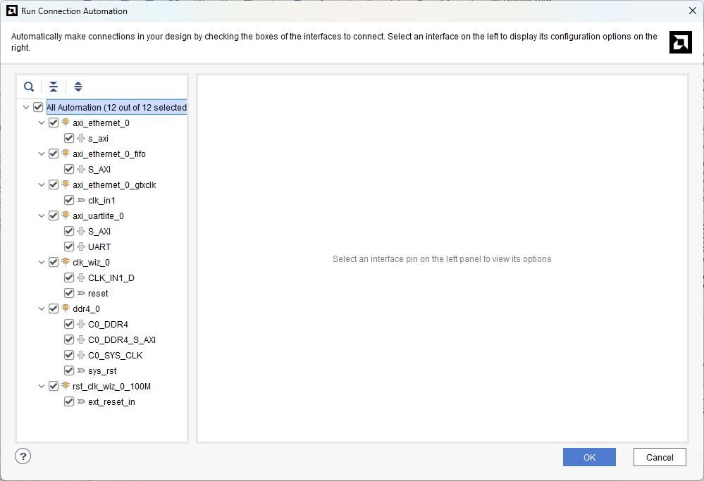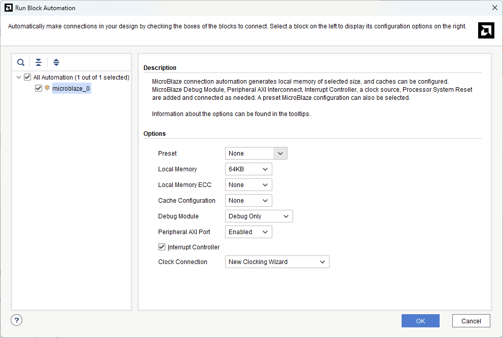 Click “Run Block Automation” present in the “Designer Assistance available” bar on the top left corner of the window to complete the design. Select the settings as shown in the following image. Click “OK” for Vivado to automatically configure the blocks for you.