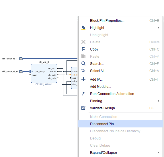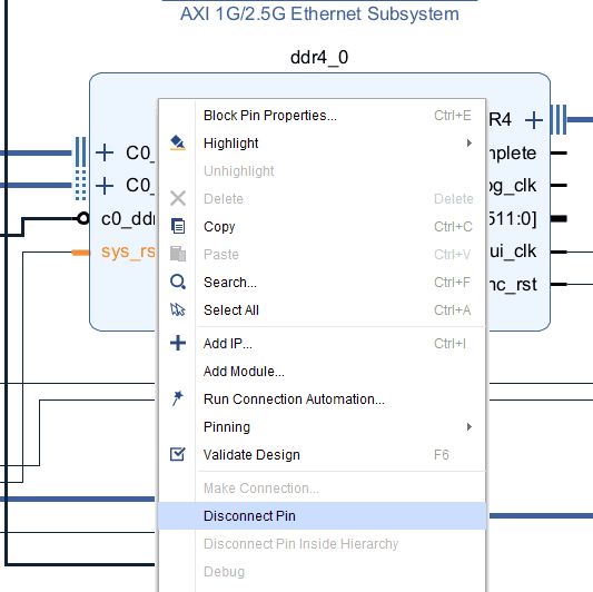 Right-click on the “ext_reset_in” of the Clocking wizard IP and click on disconnect pin. Do the same with the “sys_rst ” of the DDR4 IP.