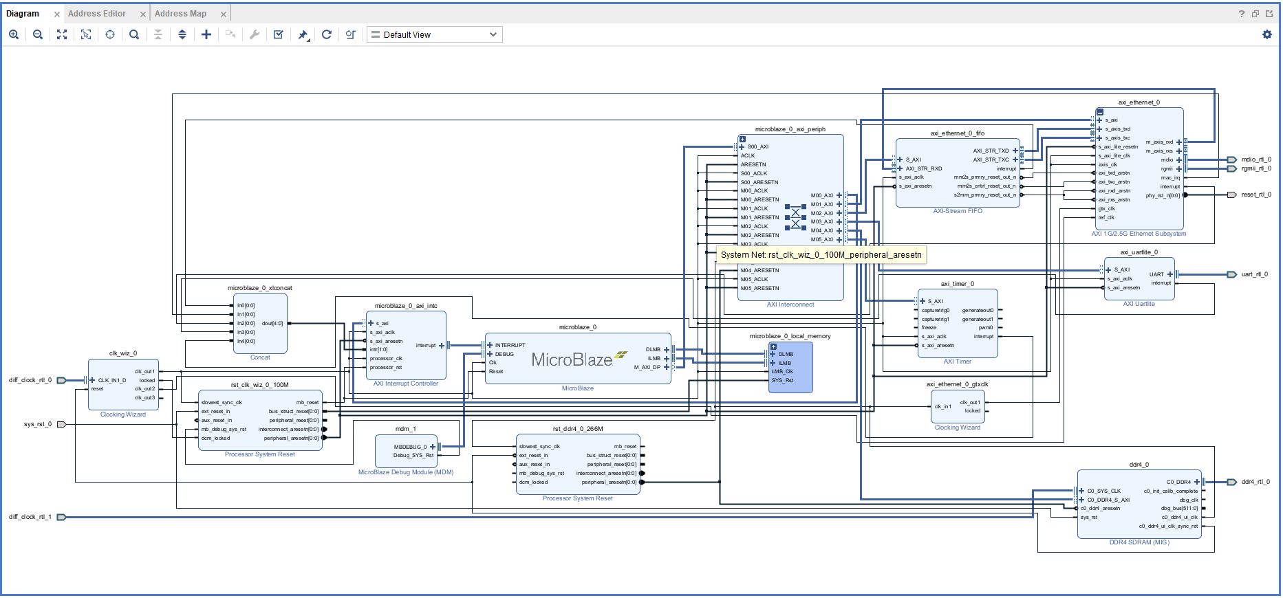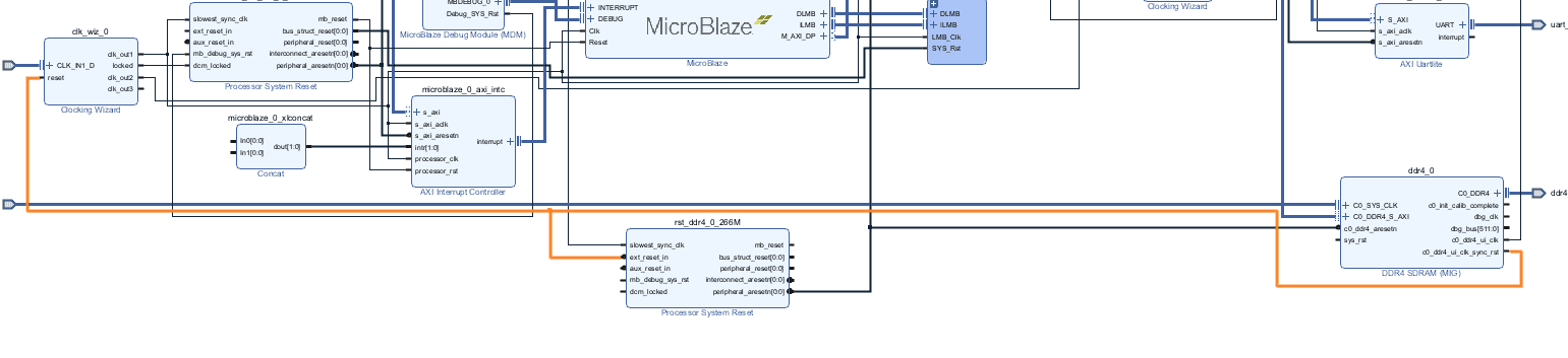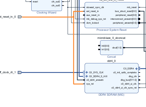 Connect the “reset” from the Clocking wizard to the Processor system block of the DDR4 IP and the DDR4 IP block