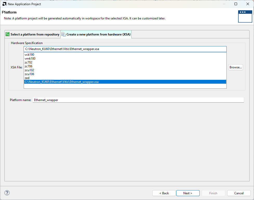 In the Platform window, select Create a new platform from the Hardware tab and import the XSA file, which is already created (Provide XSA file location). Click Next.