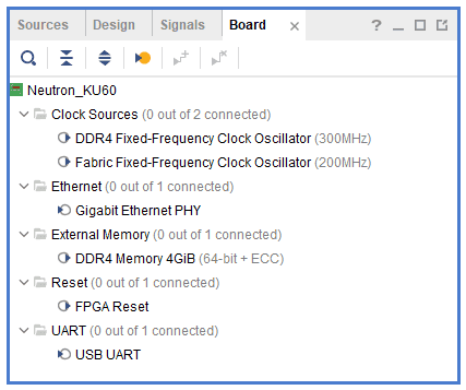Click the Board tab. The default peripherals available for the Neutron_KU60 board will be displayed.
