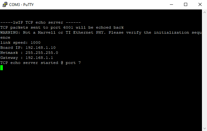 Open a telnet session with IP Address 192.168.1.10 (IP address as per main.c) at port 7, give input through the keyboard and observe the output. If you enter a character from the keyboard, you can observe the transmitted and echoed characters on telnet as shown.