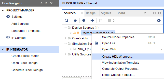 In the Sources window, right-click on the design and select Create HDL Wrapper. Click OK in the dialog box that appears.