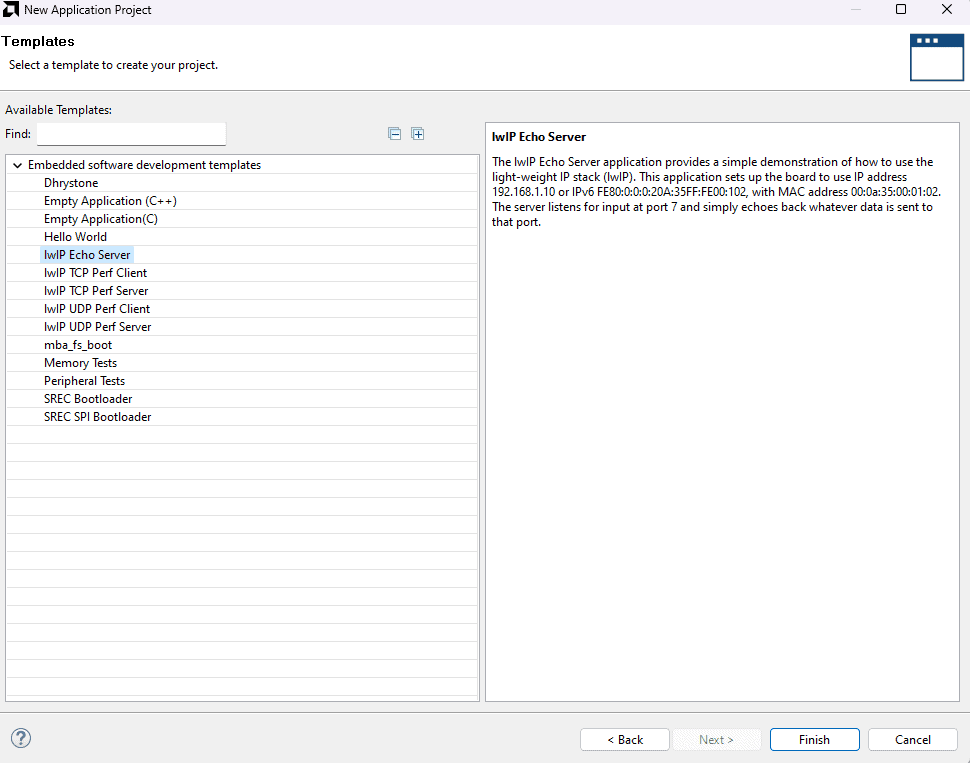 Select the lwIP Echo Server template from the list of available templates and click Finish.