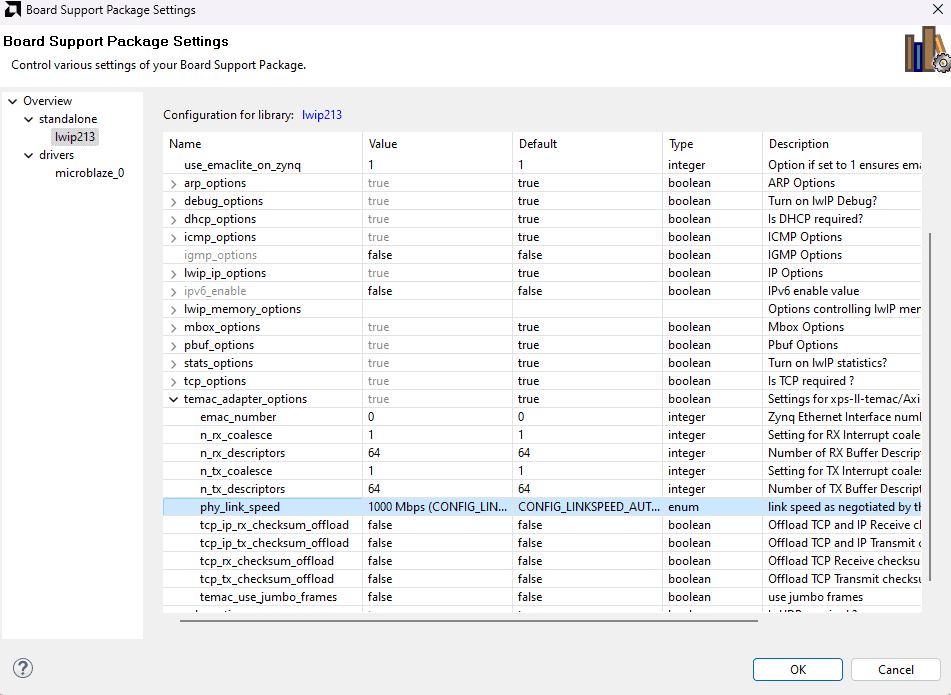 Select phy_link_speed in temac_adapter_options as CONFIG_LINKSPEED1000.