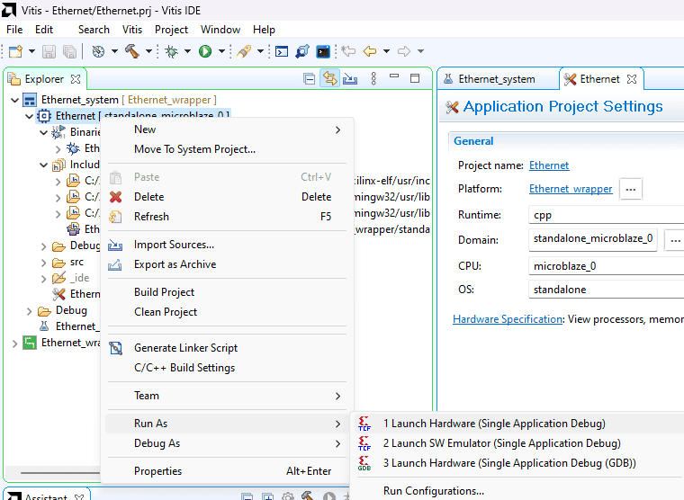 Open the COM port corresponding to Mimas A7 in any serial terminal (PuTTY, Tera Term, etc.) with a 115200 baud rate (if the UART IP baud rate is given 9600). Now, right-click on the .elf file in Project Explorer and select “Launch on Hardware” as shown below.