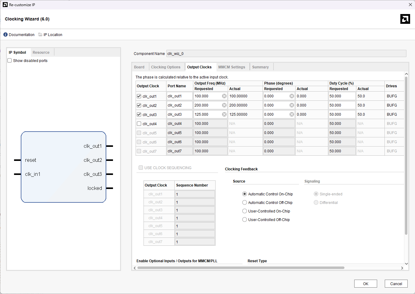 - clk_out1 frequency to 100 MHz