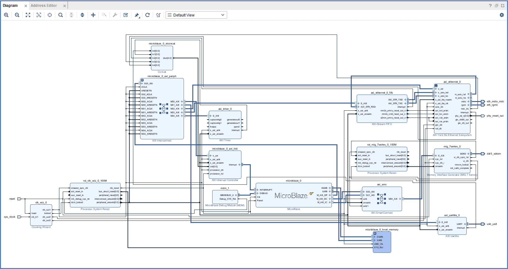 Click Run Connection Automation and select all to connect AXI interfaces of MIG, Uartlite IPs, and their clocks and resets. Uncheck the microblaze_0 part in it and click OK.