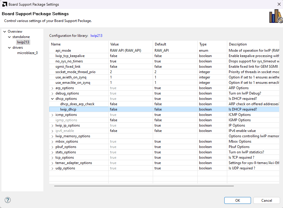 In the Board Support Package Settings window, select lwip (Iwip211) library, change the dhcp_options to “false” and ensure that “debug options” are “false”.