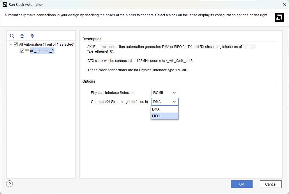 Run Block Automation for AXI Ethernet and select “FIFO” for the AXI Streaming interface.
