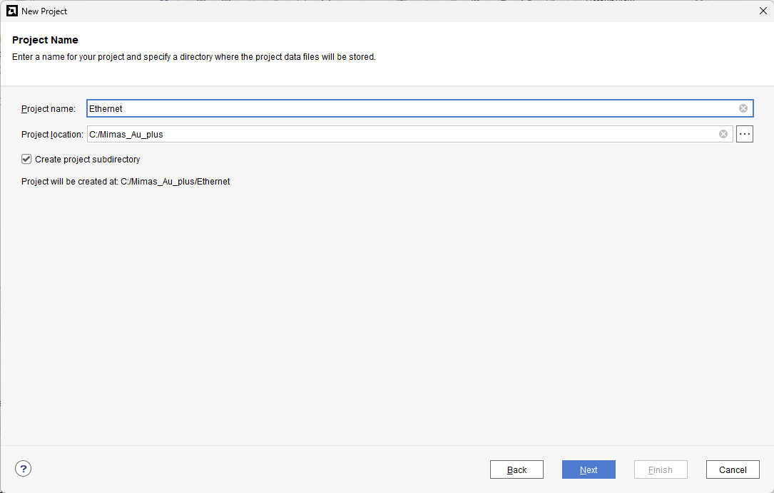Enter a name for the project and save it at a suitable location. Check the option “Create project subdirectory”. Click Next to continue.