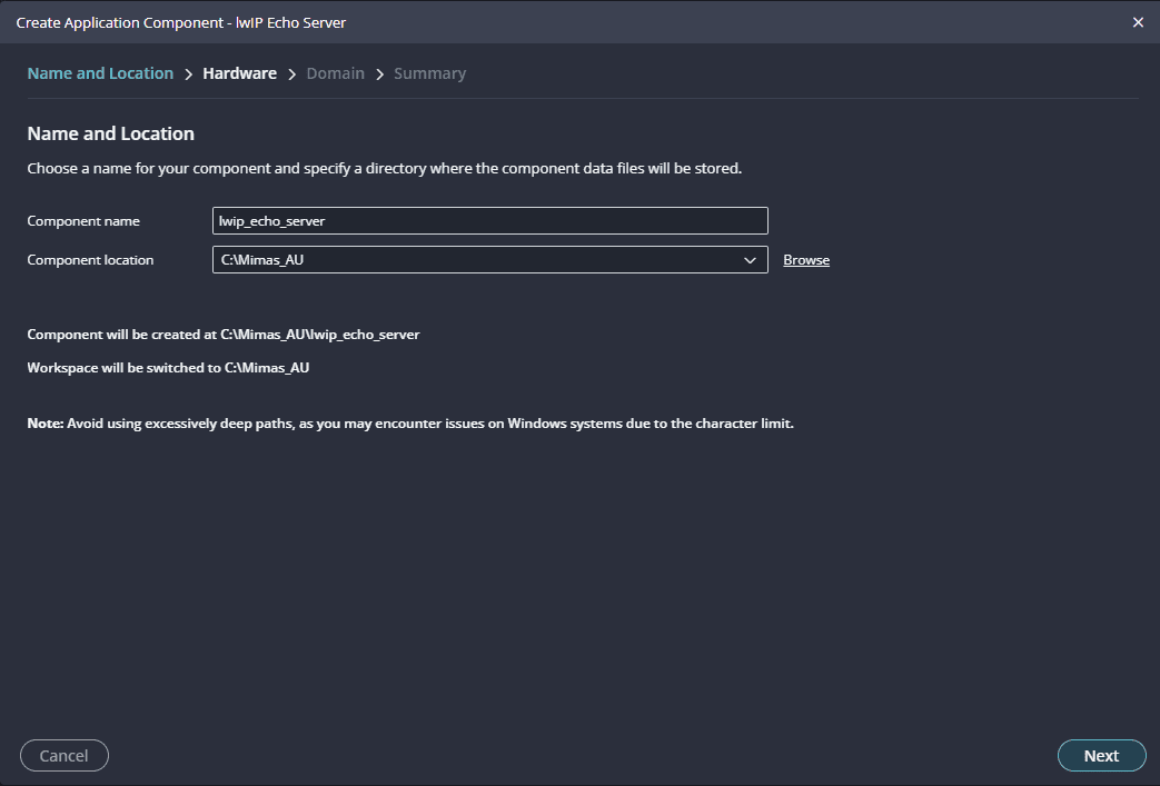 Next create the lwip echo server Application component by selecting the “IwIp Echo Server” template from the “examples”.