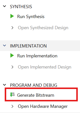 Click Generate Bitstream under the PROGRAM AND DEBUG section of Vivado to synthesize, implement and generate the bitstream.