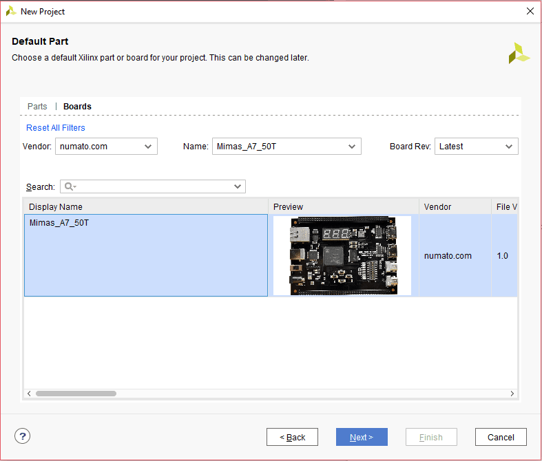 In the “Default Part” step, select “Mimas_A7_50T” from the “Boards” option. If Mimas_A7_50T is not listed, make sure board support files are installed correctly. Click “Next” to continue.
