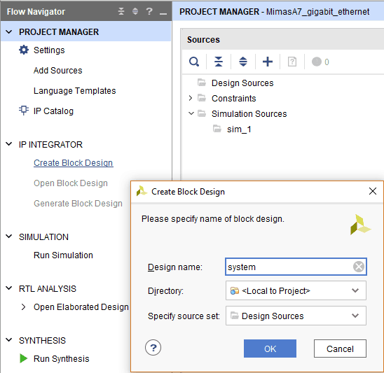 Under “Flow Navigator” panel, select “Create Block Design” under “IP INTEGRATOR”. Enter a name for the block design and click “OK”. An empty block design will be created.