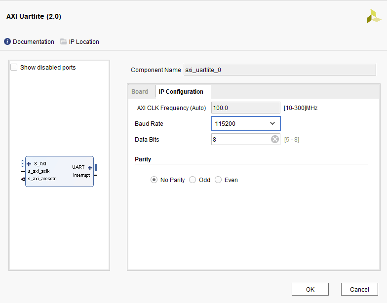 Select AXI Uartlite IP and customize it as follows.