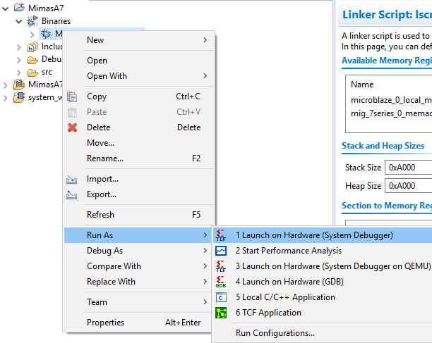 Open the COM port corresponding to Mimas A7 in any serial terminal (PuTTY, Tera Term, etc.) with 115200 baud-rate. Now, right click on the .elf file in the Project Explorer and select “Launch on Hardware” as shown below.