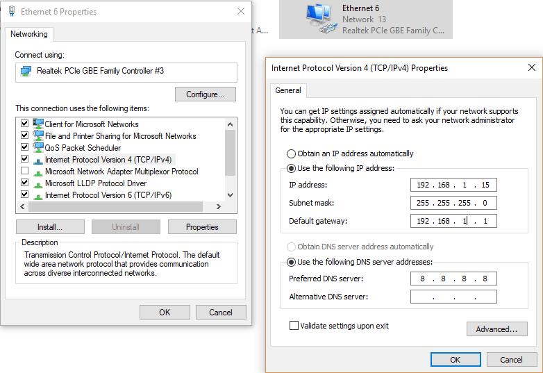 Connect Ethernet cable to the board and the other end to PC Ethernet port. Go to Control Panel. Select “Network and Sharing Centre” option in “Network and Internet”. Select “Change adapter settings”. Right click on Ethernet, click properties and select “IPv4”. Change the IPv4 address to 192.168.1.15 (any IP address can be used) and default gateway to 192.168.1.1.