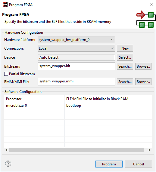 Program the FPGA on Mimas A7 with a simple boot loop program by selecting the “Program FPGA” option from the “Xilinx” menu.