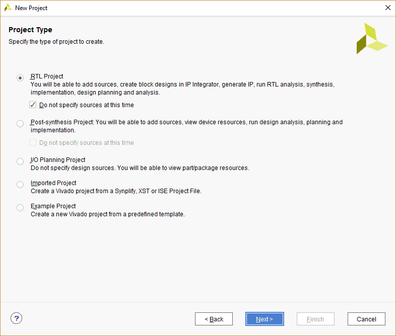 In the “Project Type” window, select “RTL Project” and select “Do not specify sources at this time” box that appears. Click “Next”.