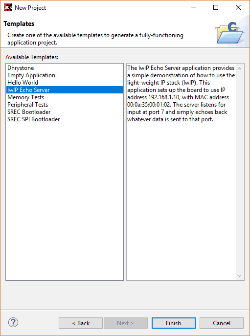 Select “lwIp Echo Server” template from the list of available templates and click “Finish”.
