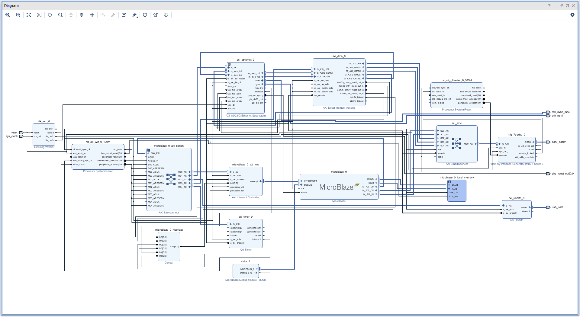 Concat block will get interrupt inputs from UART, AXI Timer, AXI DMA and AXI Ethernet subsystem. Route the following connections to the inputs of Concat block (order does not matter) :