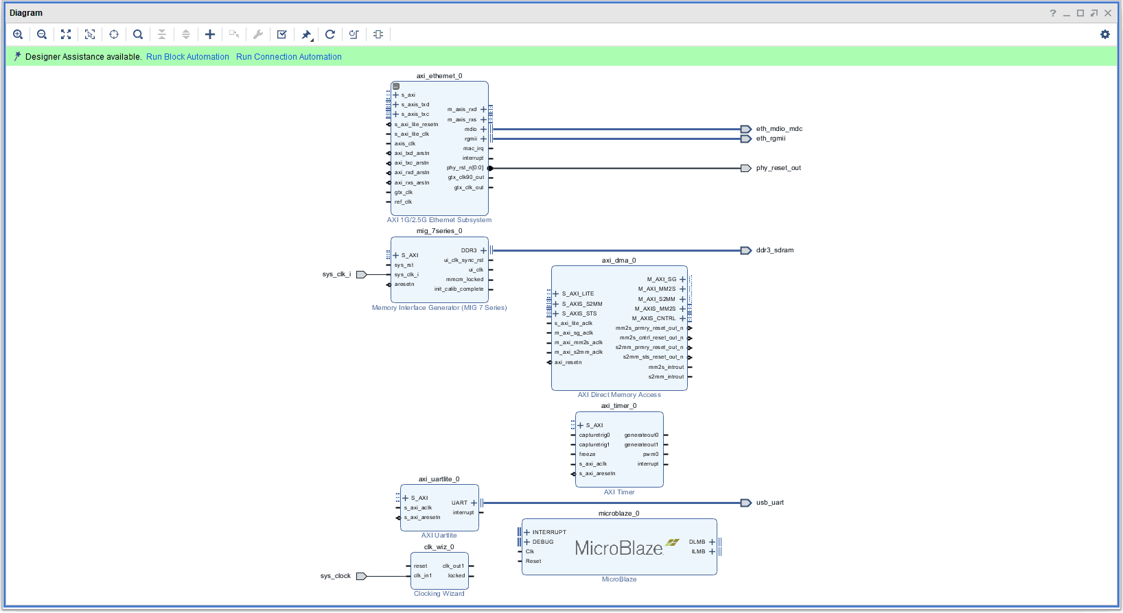 Click “Run Connection Automation”. Select the “All Automation” option and click “OK”. Vivado will automatically add new blocks such as AXI Interrupt Controller and Concat to the design. Ensure that sys_clk_i of Memory Interface Generator is connected to clk_out2.