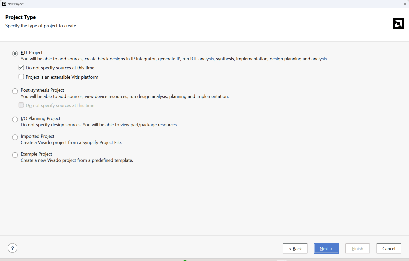 Choose “RTL Project” as project type and check the option “Do not specify sources at this time”.