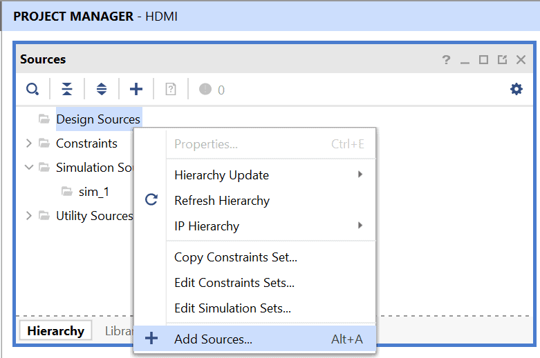 Then in the Sources tab, Right-click ‘Design Sources’ and click ‘Add Sources’. It will open a new ‘Add Sources’ window.