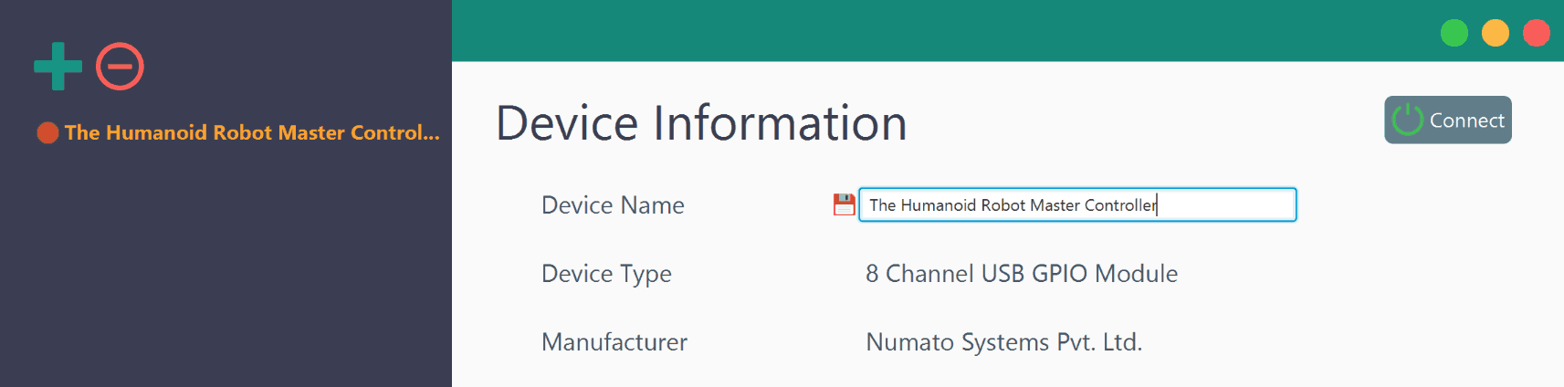 Each connected device has an associated Device Information panel. This panel can be viewed by simply clicking on the device name in the device tree on the left. Device information panel displays all relevant information about the selected device such as name, IP/Port etc.. This panel also allows the user to edit several of the fields as well. One of the most useful fields is the device name field. This field allows the user to change the device name to something that makes more sense in the specific context. For example, naming a relay module used for controlling lighting “Floor Lighting Controller”  makes more sens that simply leaving the name “8 Channel USB Relay Module”. This is especially helpful when there are several devices connected to the same PC and is being controlled by Rhea.