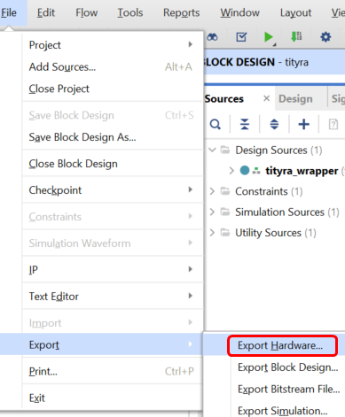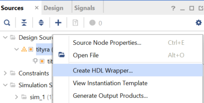 Go to “Sources” tab, right click on “tityra” design file and select “Create HDL Wrapper”. Click OK on the window that appears to finish generating wrapper.
