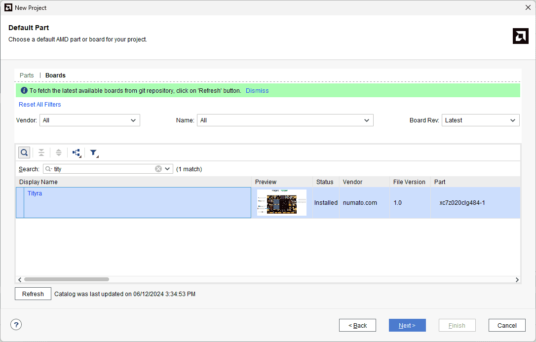 At the “Default Part” step, select “Boards” and choose Vendor as “numato.com”. Select “Tityra” and click “Next”. If tityra is not displayed in the boards list, you will need to install tityra board support files correctly.