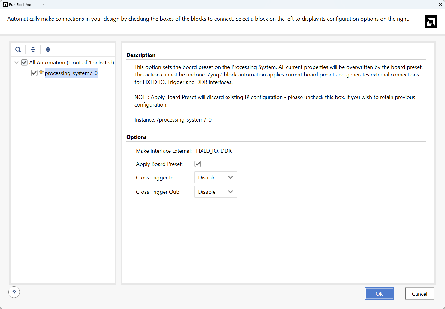 Go to Diagram window, right click and select “Add IP” from the popup menu. Search for ZYNQ7 Processing System. Add it to block design by double clicking.