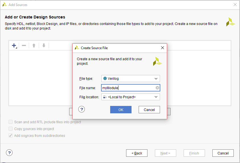 8. Now, select “Create File”. The “Create Source File” window will open, select the “File type” as “Verilog” and give the file name as in the image below. Click “OK” and then click “Finish”.
