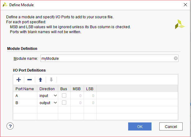 9. The “Define Module” window will open. Now, we have to add the ports required for our project. For our NOT Gate module, we will need only 2 ports. “A” as the input port and “B” as the output port. To add these ports to our project, in the “Define Module” window click on the “+” button to add ports and name the ports and change the direction of the port appropriately. Click “OK”. (refer the image below)