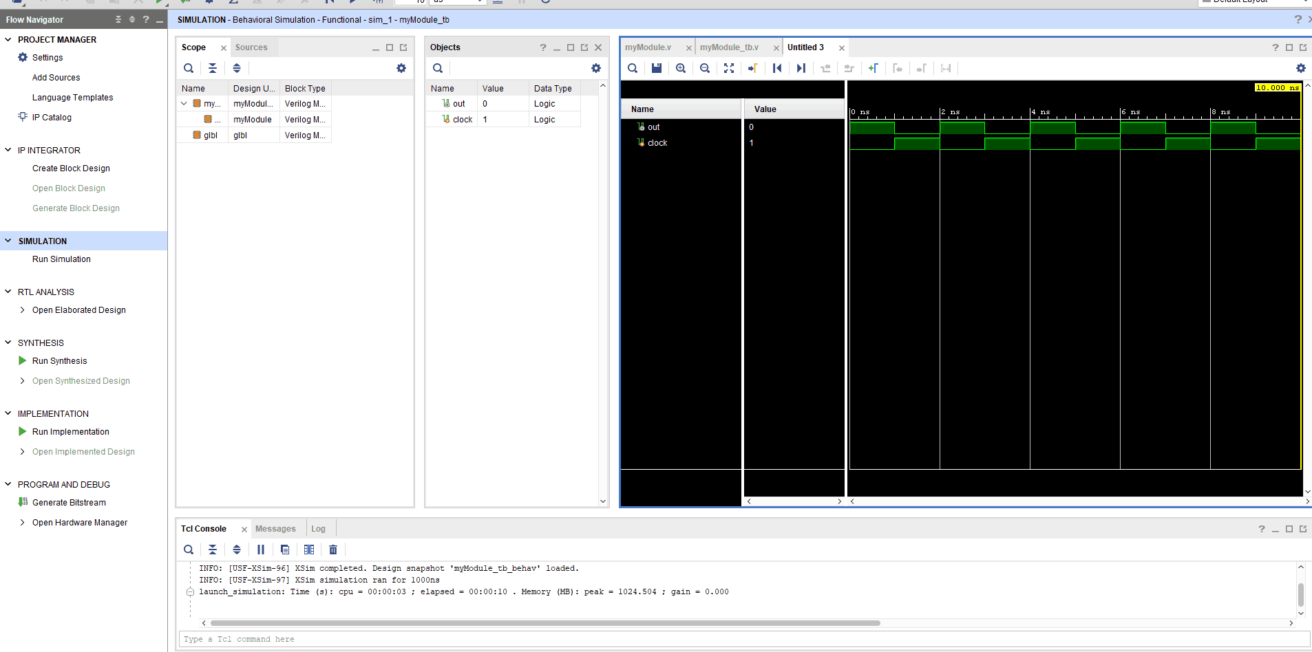 The test bench is just another module, with no I/O ports as I mentioned earlier. I have created a wire named “out” and a reg named “clock”. We will create a clock on reg “clock” by periodically inverting it and feed it to the input (port A) of myModule. The wire “out” is connected to the output port (port B) of myModule. The result should appear on the wire “out” in the simulation.