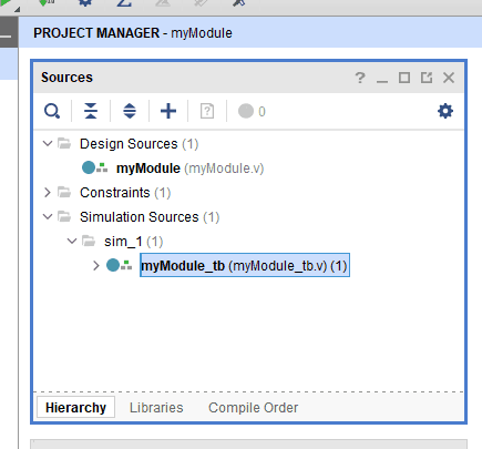 10. The source file myModule.v will be available under “Sources->Design Sources”. Double click on the source file to open it.
