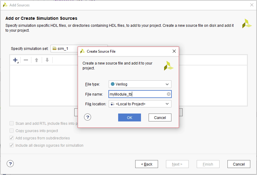 2. Select “Create File”, give the name for the test bench as “myModule_tb” and choose “File type” as “Verilog” as in the image below. Click “OK” then “Finish”.