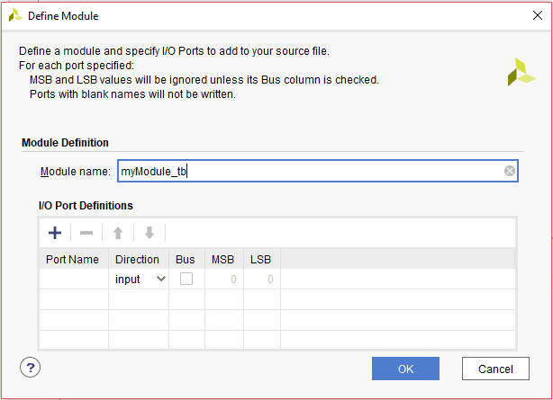 3. A test bench does not need any Inputs and Outputs, so just click “OK” and click “Yes” in the corresponding window that appears.