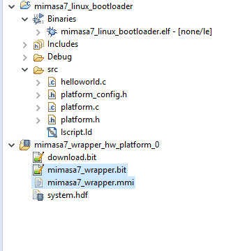 - The bit file(.bit) for the Microblaze system and the Memory Map file (.mmi) (Both files can be found in your SDK’s Project Explorer under project named “mimasa7_wrapper_hw_platform_0” or similar. Please see the image below).