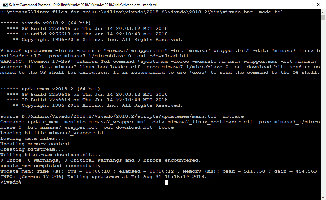 D:\Xilinx\Vivado\2018.2\Vivado\2018.2\bin\vivado.bat -mode tcl updatemem -force -meminfo "mimasa7_wrapper.mmi" -bit "mimasa7_wrapper.bit" -data "mimasa7_linux_bootloader.elf" -proc mimasa7_i/microblaze_0 -out "download.bit"