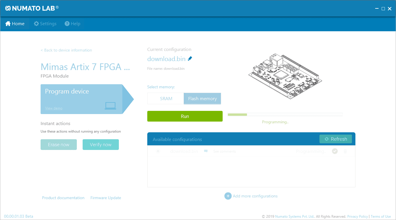 For steps on how to program Mimas A7 Mini using Tenagra, refer to the Getting started with Tenagra FPGA System Management Software article.
