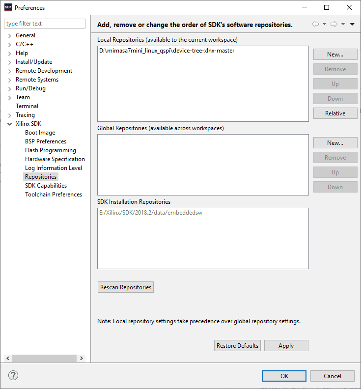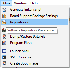 In SDK, select “Xilinx->Repositories” from the File menu. In the dialog window, select “New” and select the device tree folder which we have downloaded and extracted to SDK workspace in the “Local Repositories” section. Click “OK”.