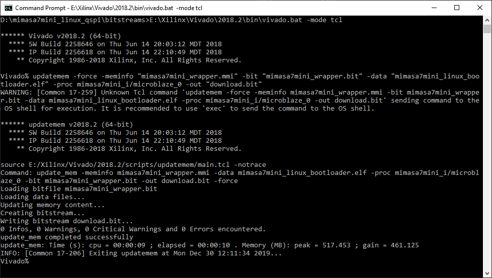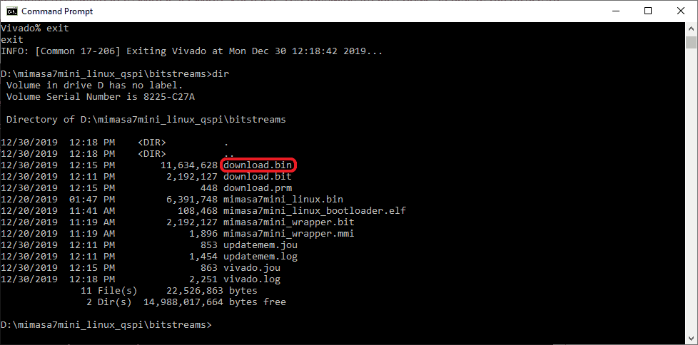 Open the command prompt and ‘cd’ to the directory where the binary files and executable file (in author case the directory is “D:\mimasa7mini_linux_spi\bitstream”) are located. Merge the Bootloader executable image with a bit file by running the following commands: